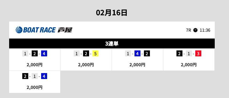 まず検証したのが2026年2月16日 芦屋7Rの無料予想。実際に会場へ足を運び、競艇ブレイブから提供された買い目で舟券を購入しました。