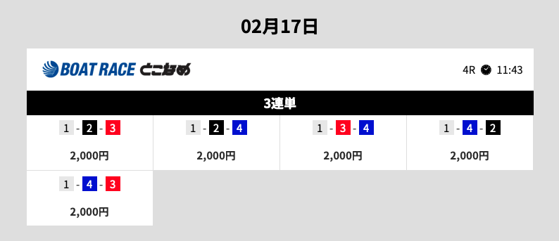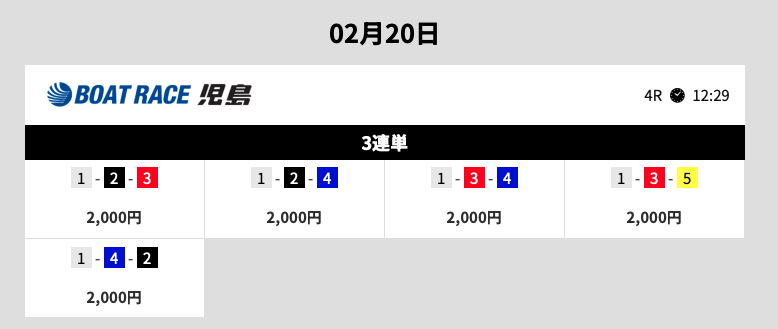 イン優勢で堅めの買い目です。しかし、買い目が5点に絞られているだけでなく、どれが当たっても利益が出るように計算されている印象を受けます。