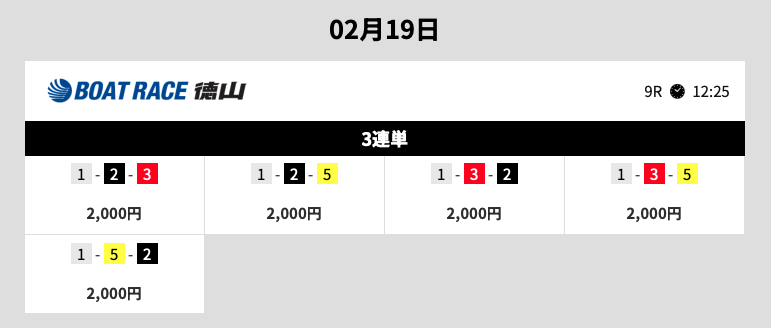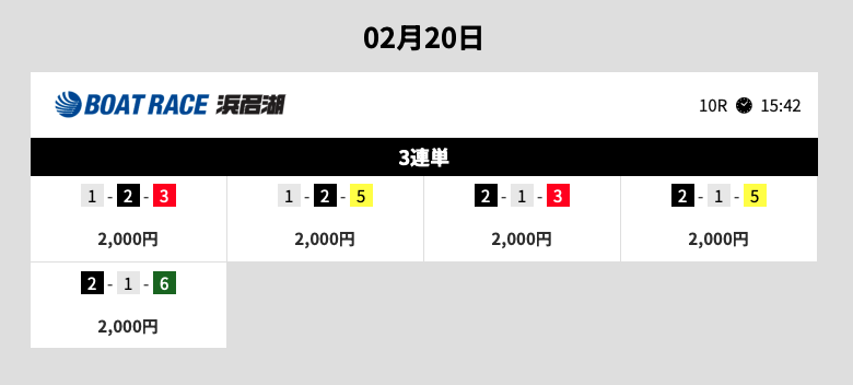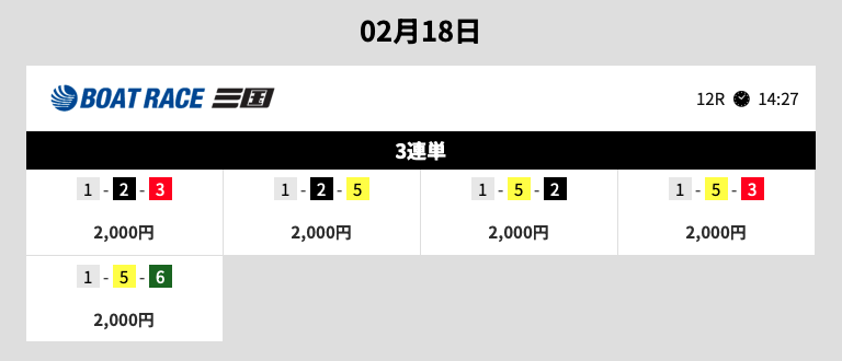 | 2026年2月19日 三国10R→江戸川9R | ◎→◎ | 10,000円 | 25,000円 | 376,270円 | +341,270円 | 1075% |