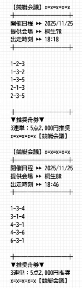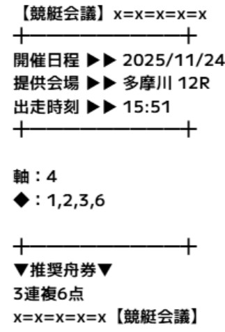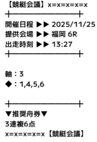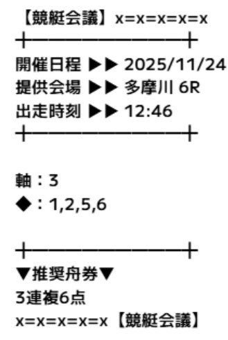 まず検証したのが2025年11月25日多摩川6Rの無料予想。実際に会場へ足を運び、競艇会議から提供された買い目で舟券を購入しました。