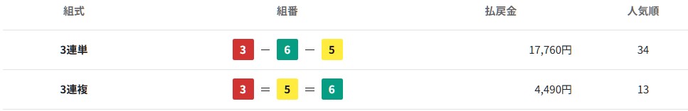 レース結果は「③=⑤=⑥】で見事的中!払戻金は44,900円になりました。6,000円の投資に対して38,900円のプラスとなり、3連複とは思えない的中額です。