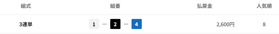 レース結果は【1-2-4】で見事的中!13,000円の払い戻しになり、40,000円の投資に対して9,000円のプラスです。