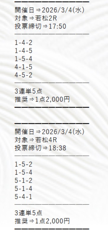 無料予想では、毎日2レースの3連単が公開されています。単発レースとなりますが、8点に絞られており、トリガミのリスクの少ない買い目です。