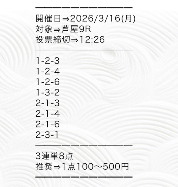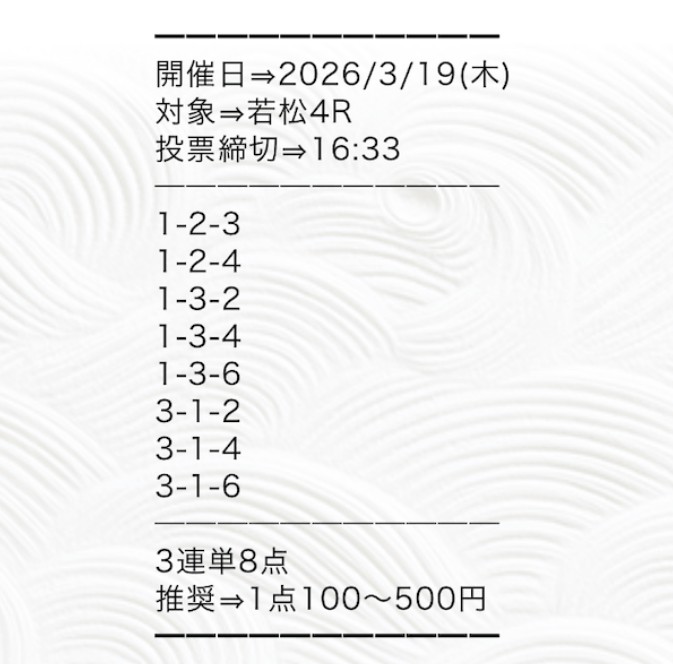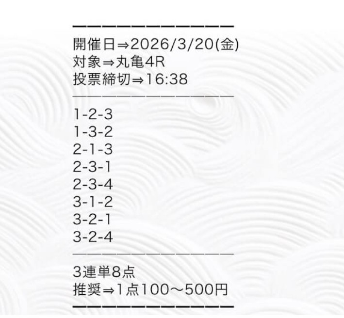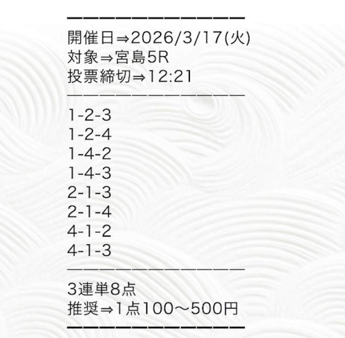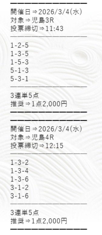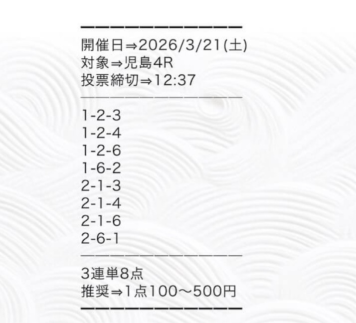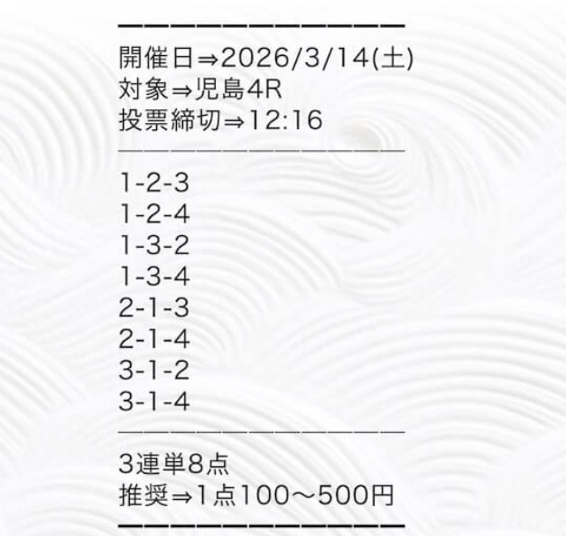 まず検証したのが2026年3月14日 児島4Rの無料予想。実際に会場へ足を運び、ボートシグナルから提供された買い目で舟券を購入しました。