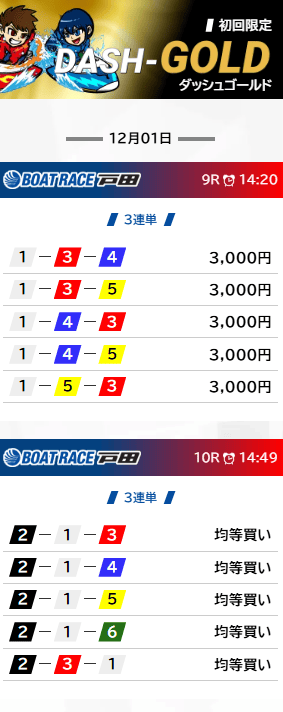 実際に購入すると3連単2レースコロガシの予想が提供されました。